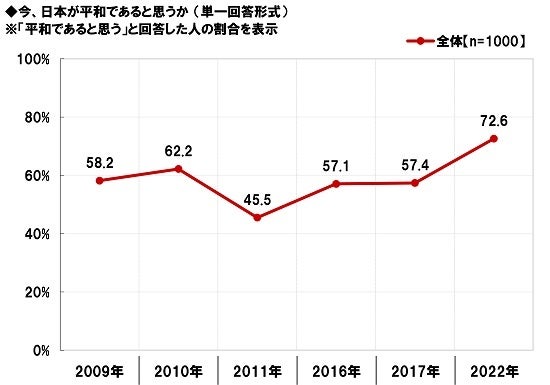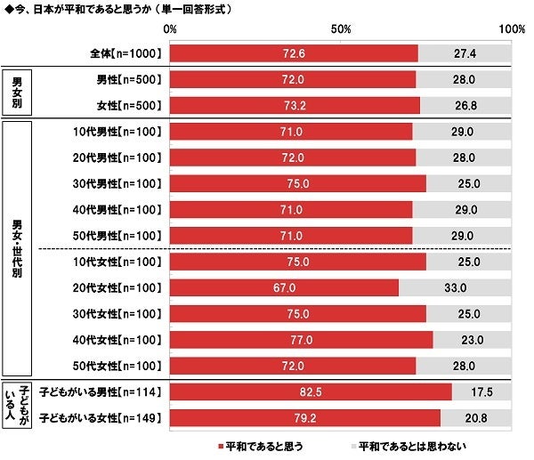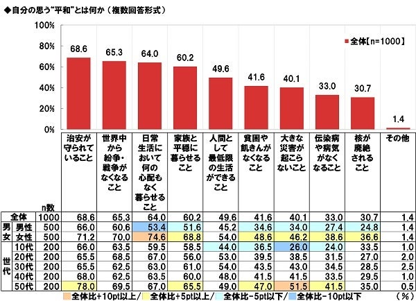 - 日本人が考える“平和”とは? 1位「治安が守られていること」2位「世界中から紛争・戦争がなくなること」、女性では「日常生活において何の心配もなく暮らせること」が1位に