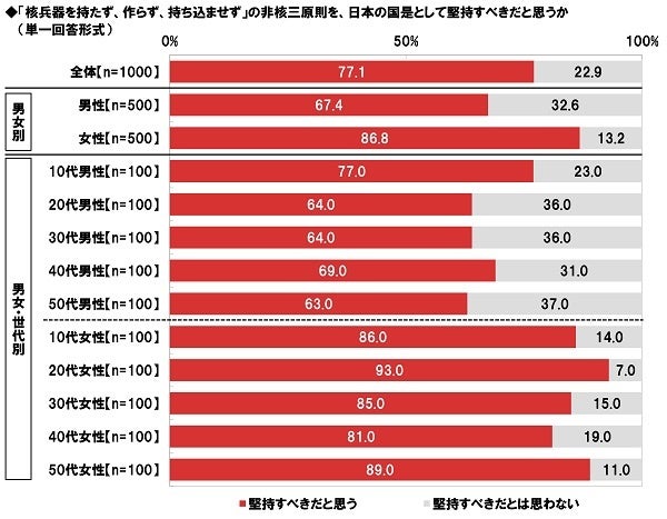 - 「非核三原則を日本の国是として堅持すべき」全体の77%、50代男性では63%、20代女性では93%