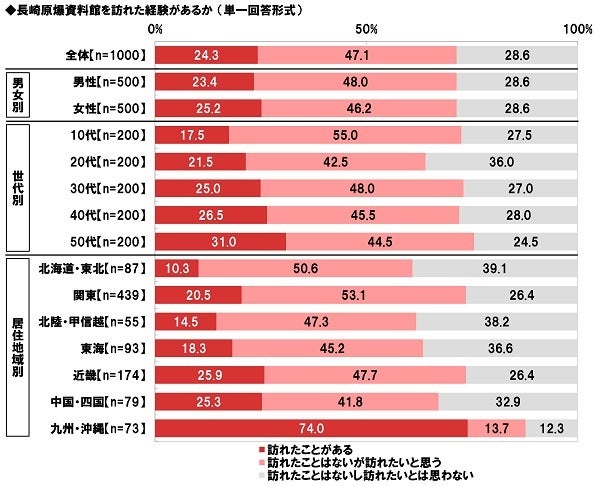 また、居住地域別にみると、「訪れたことがある」は、長崎県が含まれる九州・沖縄(74.0%)が突出して高くなり、北海道・東北では10.3%、北陸・甲信越では14.5%、東海では18.3%と、2割に満たない結果となった。