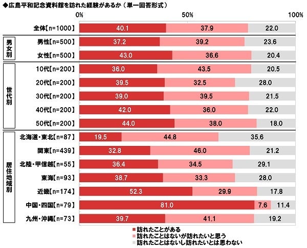 全回答者(1,000名)に、広島平和記念資料館(広島県)を訪れたことがあるか聞いたところ、「訪れたことがある」は40.1%、「訪れたことはないが訪れたいと思う」は37.9%となった。