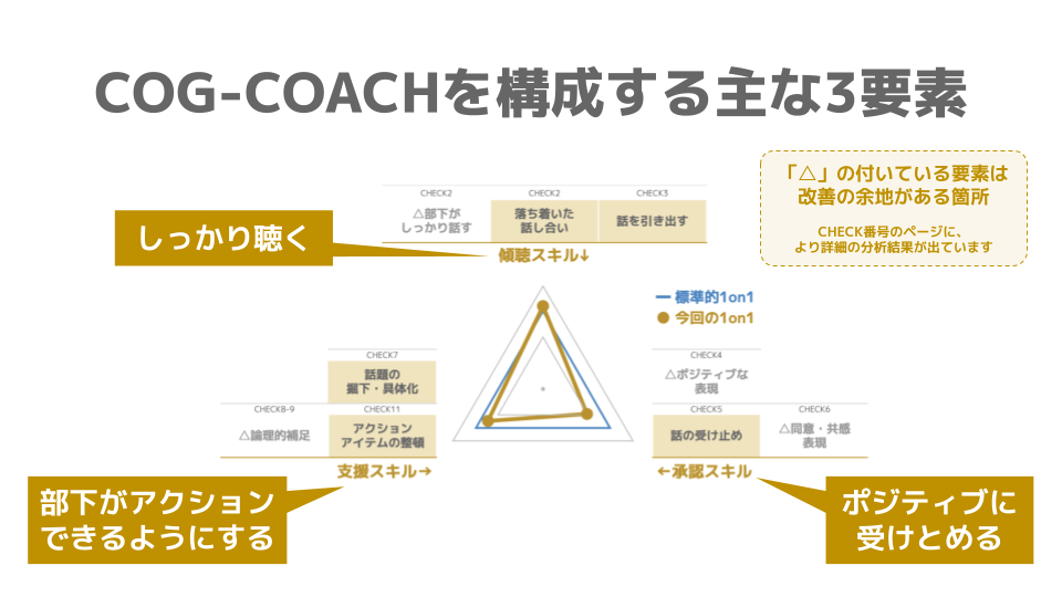 COG-COACHでは、1on1中の話し合いを録音するだけで、しっかりと部下の話を聞くことができているかを測る「傾聴スキル」、部下の考えに同意・共感ができているかを測る「承認スキル」、部下に具体的なアクションを起こすよう促しているかを測る「支援スキル」というコーチングに重要な3要素を12のチェック項目を用いて分析できます。