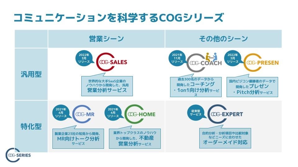 ◯ 事業内容 :「認知バイアスを取り除く」ためのソフトウェアを開発。20,000本を超える解析結果データベースを使って、接客・プレゼン・会議等の好成績者・チームの傾向をモデル化し、定量的に比較評価する解析サービス「COGシリーズ」を提供