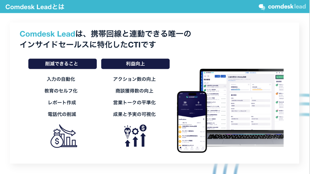 「Comdesk Lead」は、IP回線と携帯回線を併用できる国内唯一*1のCTIシステム。電話による営業活動を効率化し、収益性を最⼤化させるためのコミュニケーション・プラットフォームです。通常の営業活動やインサイドセールスの強化などを⽬的に、これまでに累計導入社数500社以上、導入IDも10,000以上の実績*2 があります。