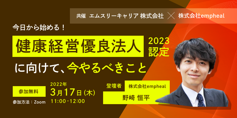 今回のセミナーでは、健康経営優良法人認定の新規取得や継続に向けた支援を行う株式会社emphealの健康経営アドバイザー・野崎恒平氏が、健康経営優良法人2023認定に向けて、健康経営優良法人や認定項目についての解説、今後の認定制度の展開などについて講演します。今年度初めて認定を目指す企業様でも、計画的に準備を進められる情報を提供いたします。