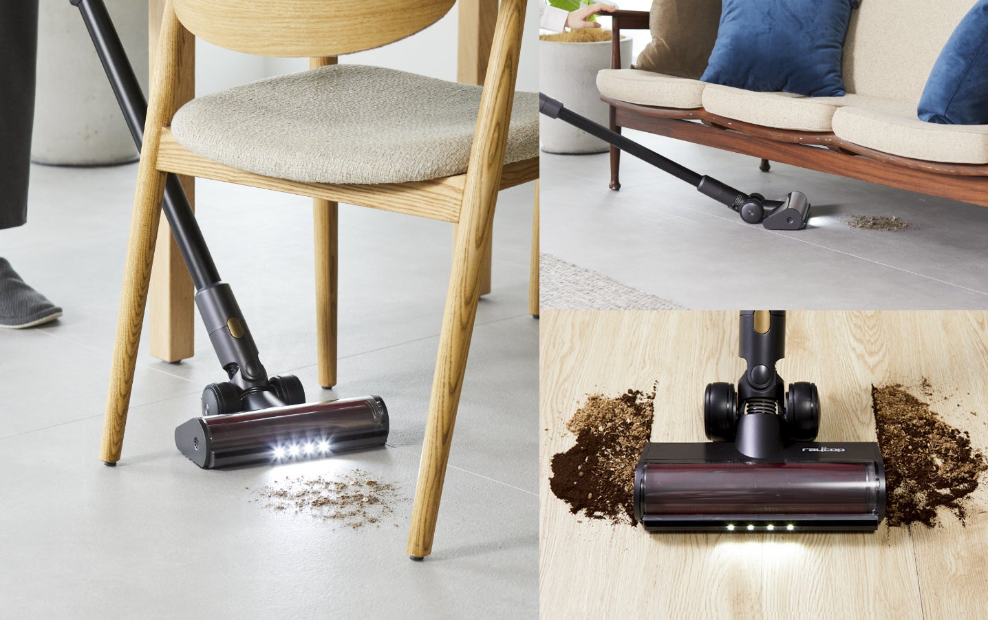 さらに隙間や角を照らしながら自在に動くヘッドが、汚れを確認できる状態でぐんぐん吸い込んでくれます。充電用のアダプターを取り付ける位置も高い位置にあり、かがまなくてもいいのが嬉しいですね。直立スタンドもスタイリッシュでリビングに置いてもインテリアとして映えるデザイン。