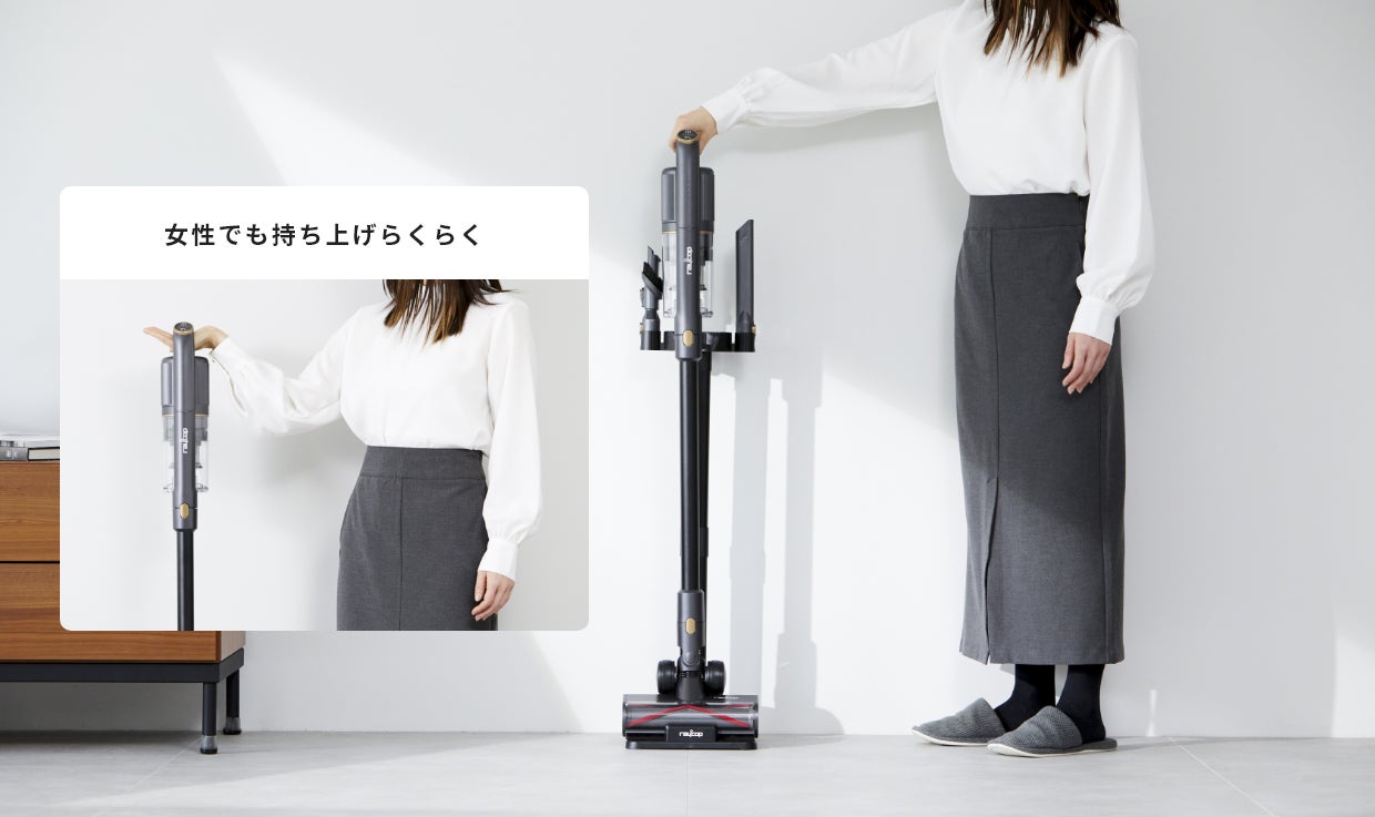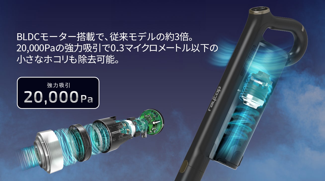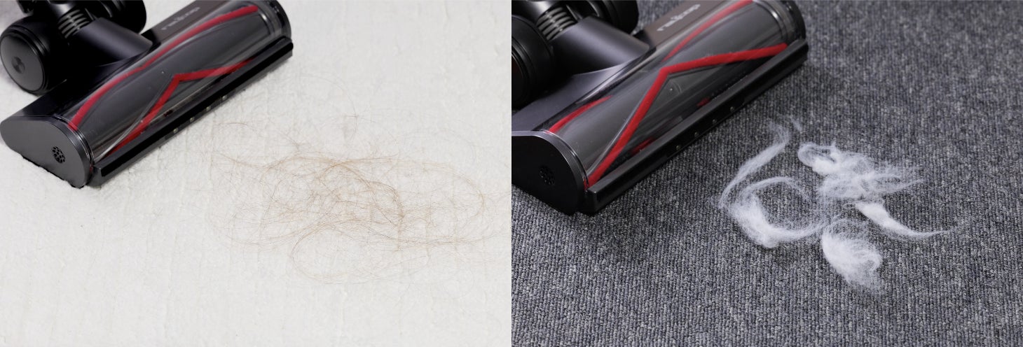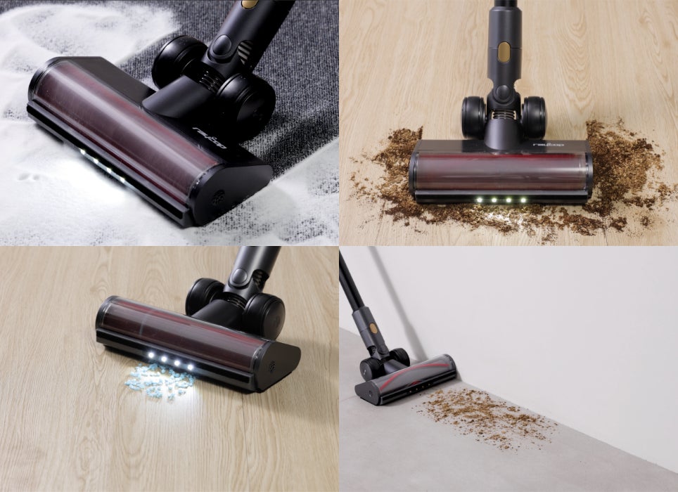 BLDCモーターにより20,000Paの強力な吸引力を実現し、細かいホコリや砂、ゴミも確実に除去します。また、革新的なモーターブラシが強力なグリップ力を発揮し、長い髪の毛やペットの毛が絡みにくい設計で、ブラシの掃除の手間を大幅に軽減します。加えて、ヘッド前面に搭載された高光量LEDライトが、暗い場所や狭い隙間のホコリを可視化し、見逃しがちなゴミも確実に除去します。