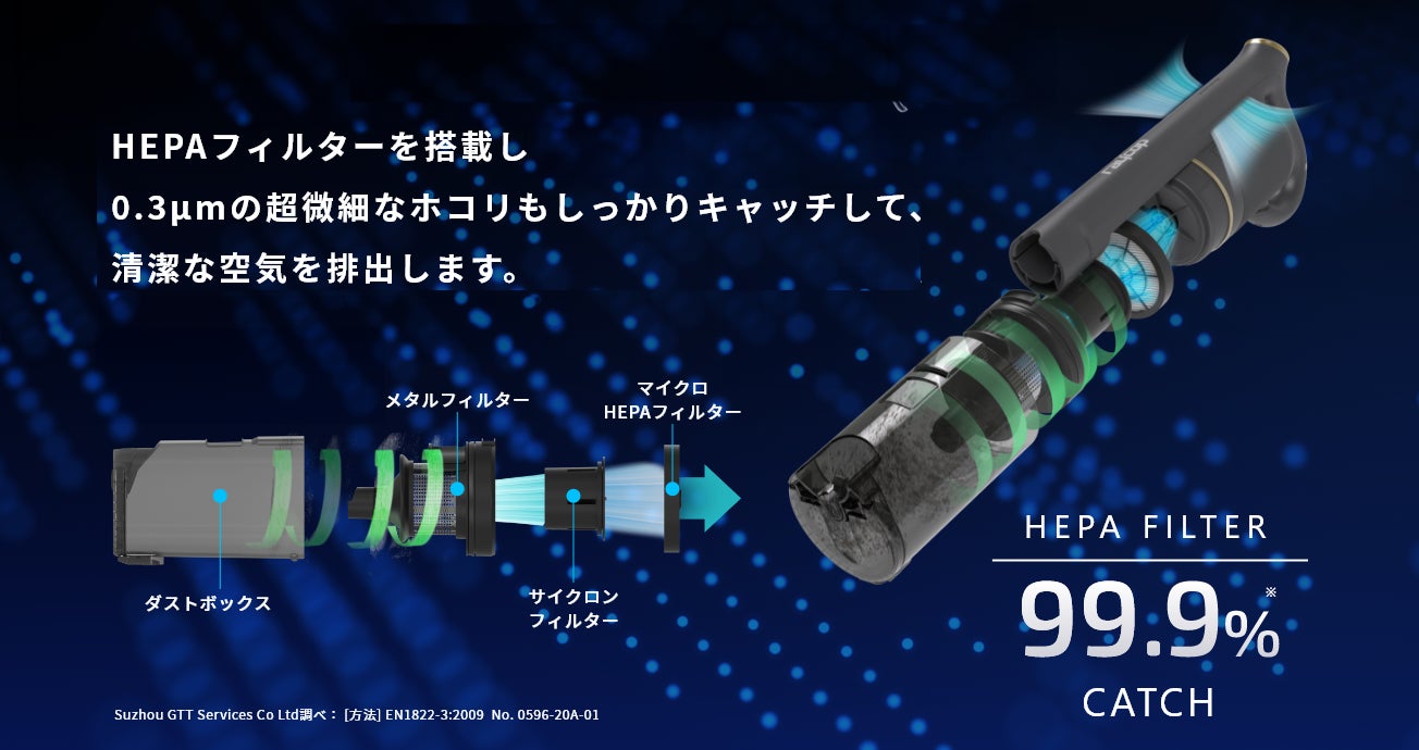 HEPAフィルター搭載で0.3μの超微細なホコリも99.9%キャッチ