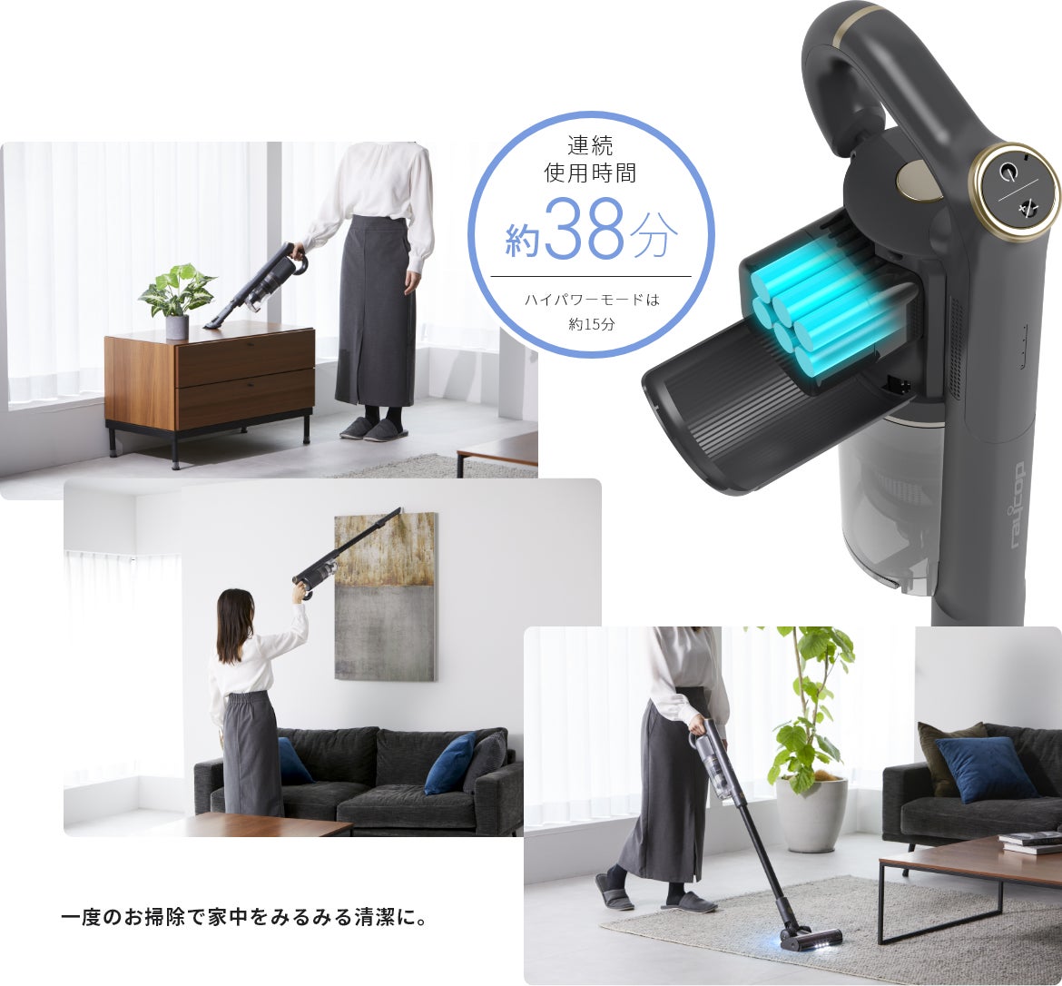 最大約38分稼働の大容量バッテリーで、掃除中のバッテリー切れの心配なし