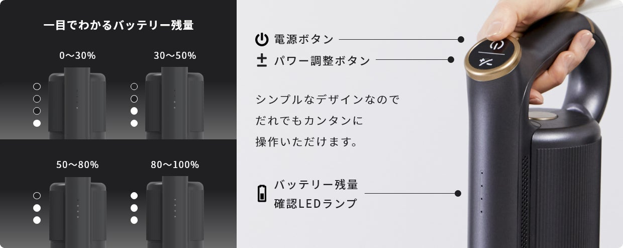 バッテリー残量表示と簡単操作ボタンで、直感的に使えるシンプルなパネル