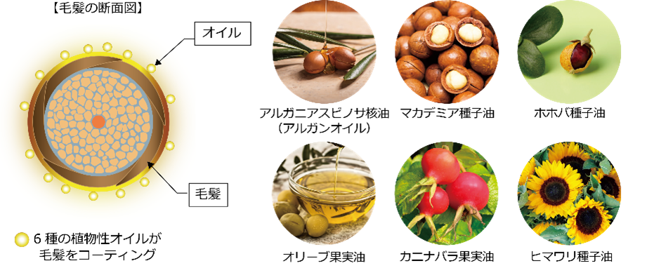 アルガンオイルやマカデミア種子油等、6種の植物オイルを配合し、髪の外側からコーティングすることで、外部の乾燥や熱から髪を守ります。
