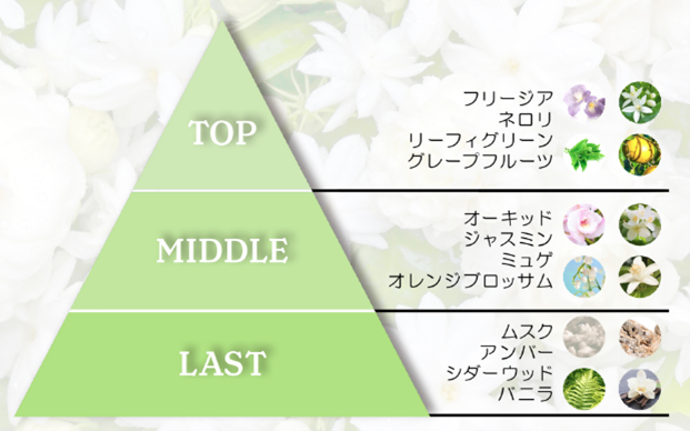 爽やかなフリージアやネロリの澄んだ香りをトップに、オーキッド、ミュゲ、ジャスミンのみずみずしく透明感のある白い花々の香りが重なり、ラストは繊細なムスクとアンバーが柔らかく溶け込みます。