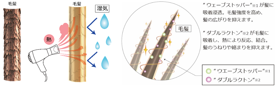 “ウェーブストッパー”が毛髪のダメージ部位を補修して毛髪強度を高め、日常の振動(例:歩行等)による髪の広がりを抑制します。さらに、毛髪表面を疎水性に傾けながら、水分コントロールを行うことで毛髪形状を安定化させ、外部からの湿気等をバリアすることで、うねりが生じにくい髪にします。