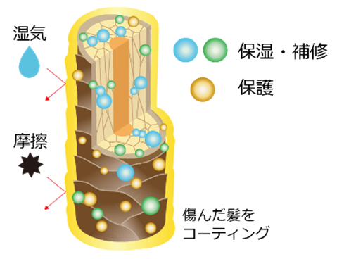 様々なダメージを受けて空洞化してしまった髪の内側を保湿・補修成分で満たし、コーティング成分で傷んだ髪表面を保護します。