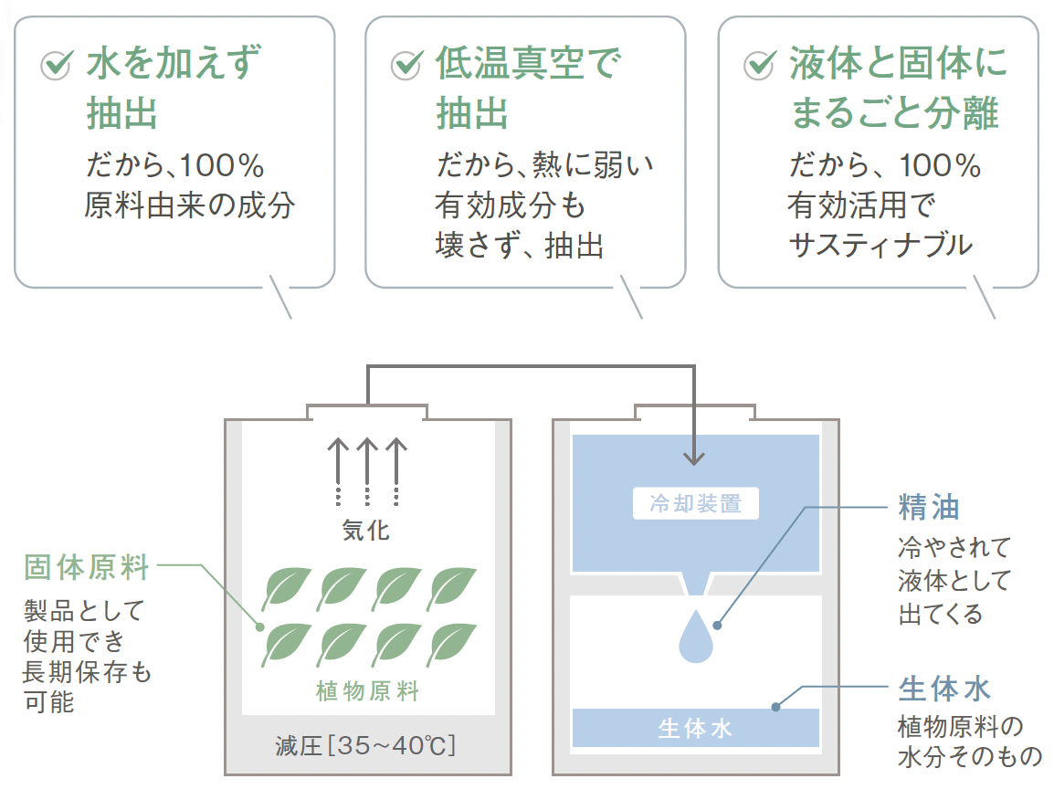 ウチワサボテンのもつ美肌成分を余すことなく抽出減圧することで成分を分離して抽出するため、水や溶剤を一切使わず、低温(35℃~40℃)での抽出が可能。