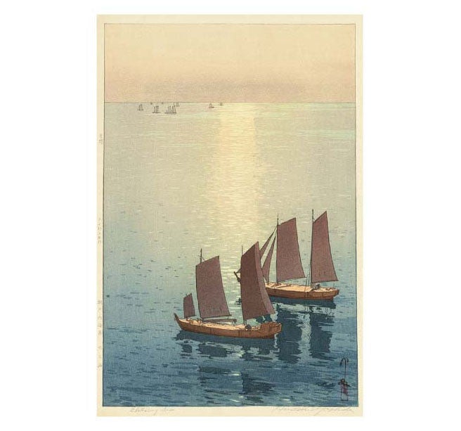 凪いだ瀬戸内海に静かに浮かぶ帆船と、水面にきらめく一筋の光の道。丸ノミの彫り跡を活かした表現が、まばゆい光の反射を生み出し、観る者の目を奪います。洋画と水彩画の修練を積んだ吉田ならではの観察眼が、伝統的な木版画に新たな風を吹き込みました。故ダイアナ元英国皇太子妃がケンジントン宮殿に飾っていたことでも知られる名品です。