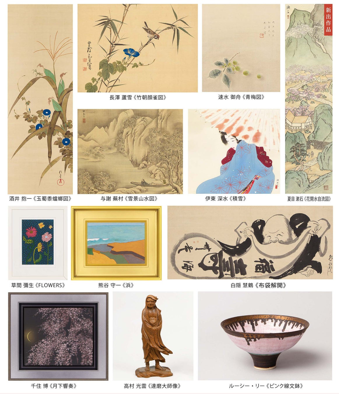 江戸期の伊藤若冲、円山應挙、与謝蕪村、葛飾北斎、酒井抱一から横山大観、菱田春草、上村松園、鏑木清方、速水御舟、千住博ら近現代の巨匠まで日本画の名品はもちろん、徳川家光や仙厓義梵による奥深い味わいの“かわいい”墨画、安井曾太郎、香月泰男、松本竣介ら近代洋画壇を代表する画家たちの逸品も出品いたします。さらには文豪・夏目漱石の主治医が旧蔵していた最晩年の山水画、古筆随一の名品と名高い“王聖武”や藤原俊成が自撰の和歌を書写した《日野切》、謎多き象牙彫刻家・安藤緑山による超絶技巧の《あやめ》といった目にする機会も稀な作品など、最高峰の美術品が一堂に会します。