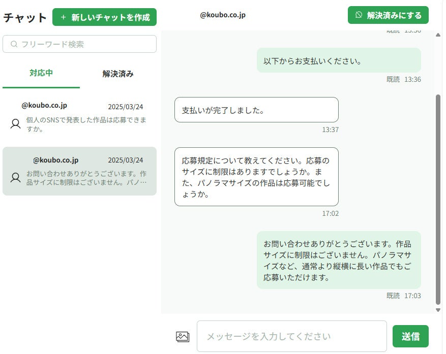 何度かのやり取りの後、問い合わせ内容が解決したら「解決済みにする」ボタンを押してクローズ