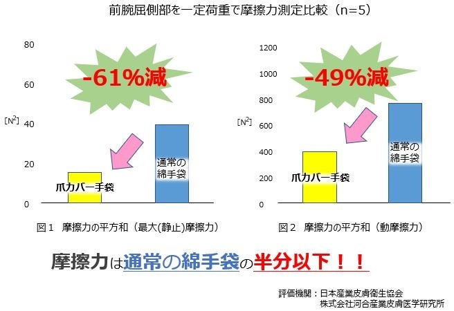 本検証において、手袋の指先に低摩擦コーティングを施すことによって皮膚との間に生じる摩擦力が低減されることが示されました。皮膚摩擦力に起因する皮膚刺激性においても本コーティングを施すことによって減少することが示唆され、敏感肌の掻きむしりによる皮膚刺激を低減することが期待できます。