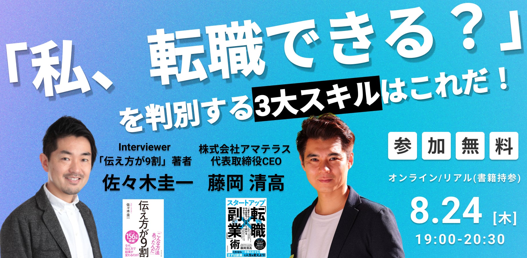 スタートアップにコアメンバーとして参画するための転職・副業サイトを運用している株式会社アマテラス(本社:東京都目黒区、代表取締役:藤岡清高)は、2023年8月24日(木)19:00よりhppps link tokyo(東京都渋谷区)にてに、世界256万部『伝え方が9割』の著者佐々木圭一氏、藤岡清高の対談イベントを開いたします。