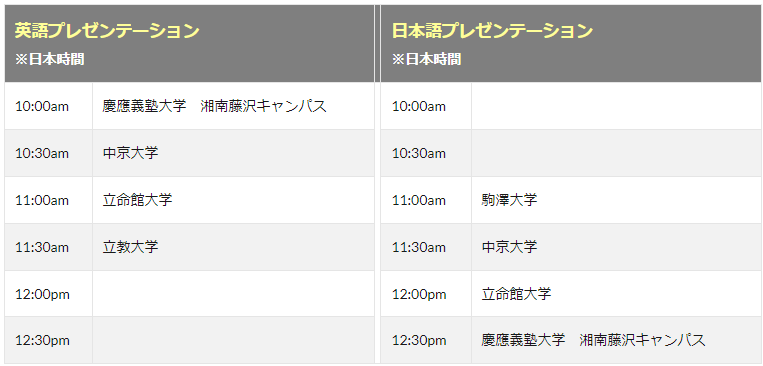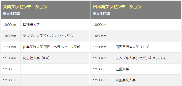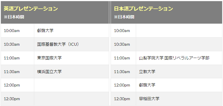 青山学院大学、叡啓大学、近畿大学、慶応義塾大学湘南藤沢キャンパス(SFC)、国際基督教大学(ICU)、駒澤大学、中京大学、テンプル大学ジャパンキャンパス、東京国際大学、同志社大学、山梨学院大学国際リベラルアーツ学部、横浜国立大学、立教大学、立命館大学、早稲田大学