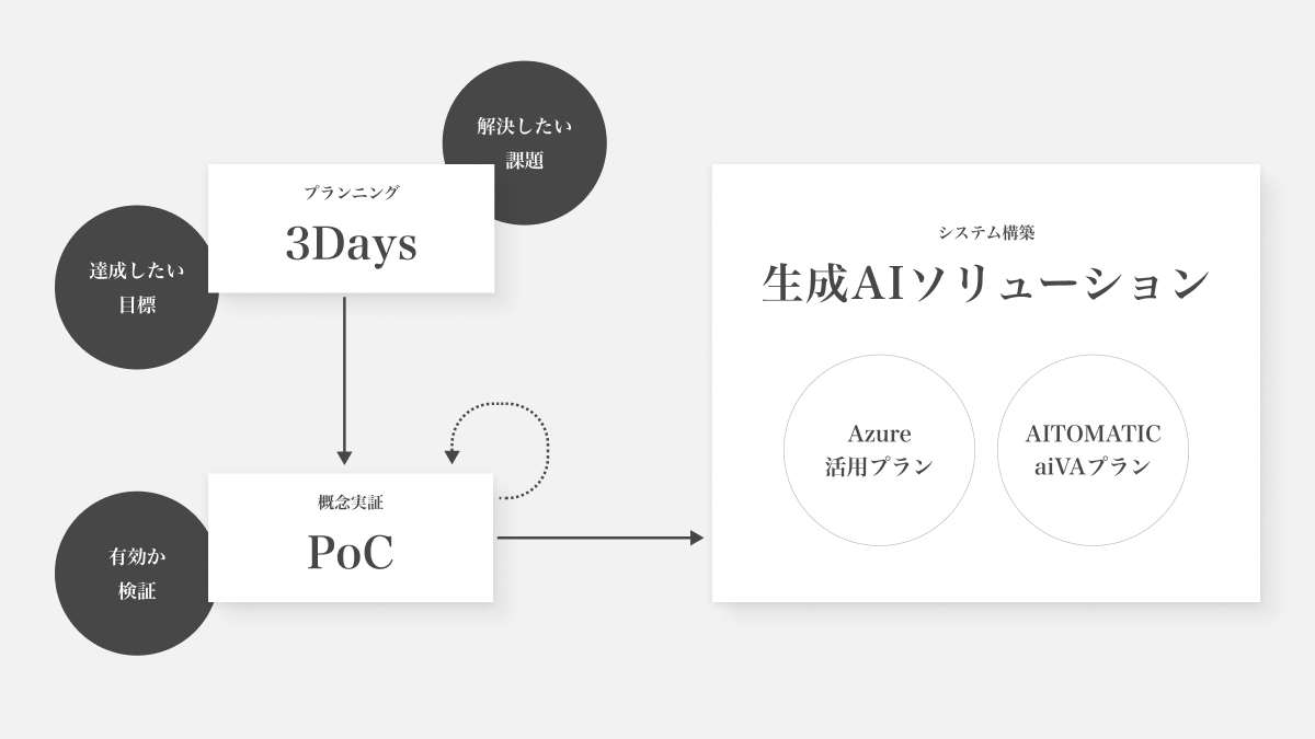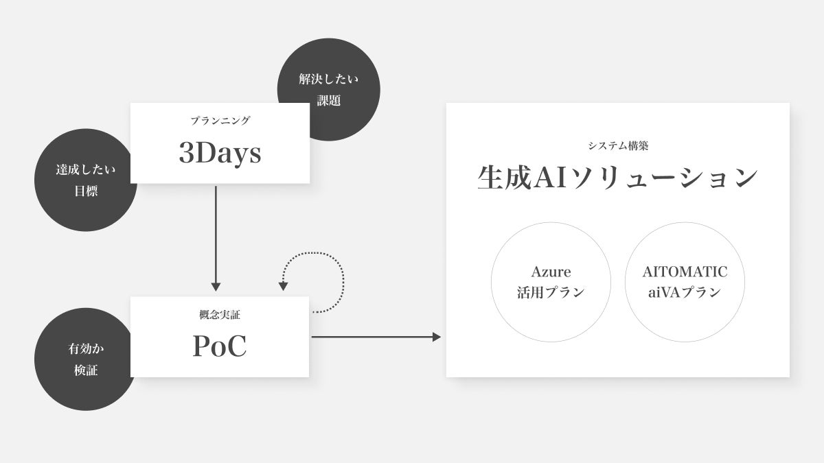 企業独自のニーズに合わせた生成AIソリューションを提供します。Microsoft Azureを活用した専門的指導やAitomatic社のaiVAを用いたナレッジマネジメント、意思決定に至るまで、企業のデジタル変革を全面的にサポートします。