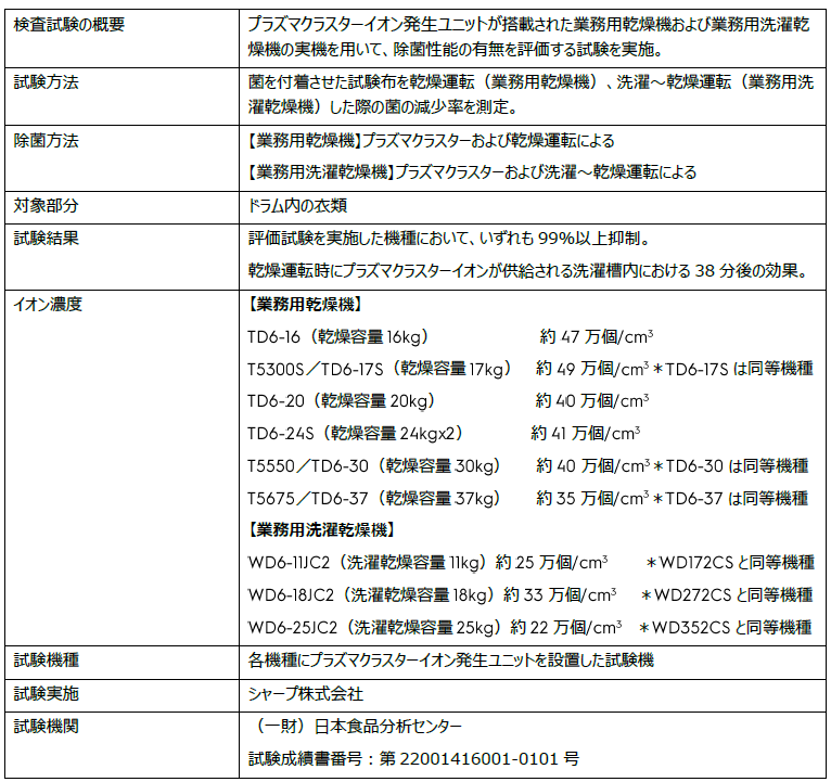 | 検査試験の概要 | プラズマクラスターイオン発生ユニットが搭載された業務用乾燥機および業務用洗濯乾燥機の実機を用いて、除菌性能の有無を評価する試験を実施。 |