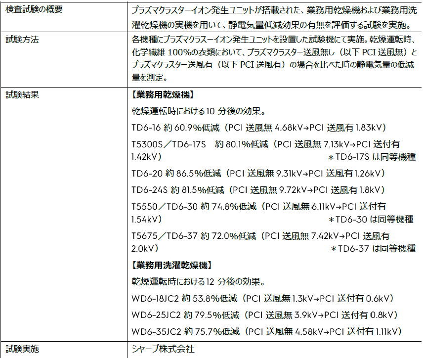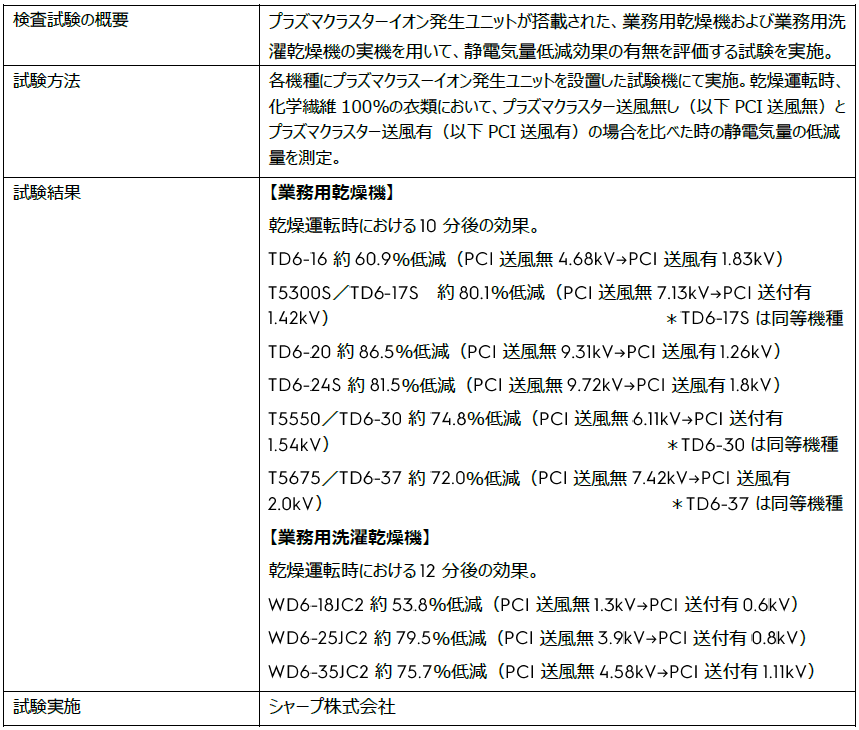 | 検査試験の概要 | プラズマクラスターイオン発生ユニットが搭載された、業務用乾燥機および業務用洗濯乾燥機の実機を用いて、静電気量低減効果の有無を評価する試験を実施。 |