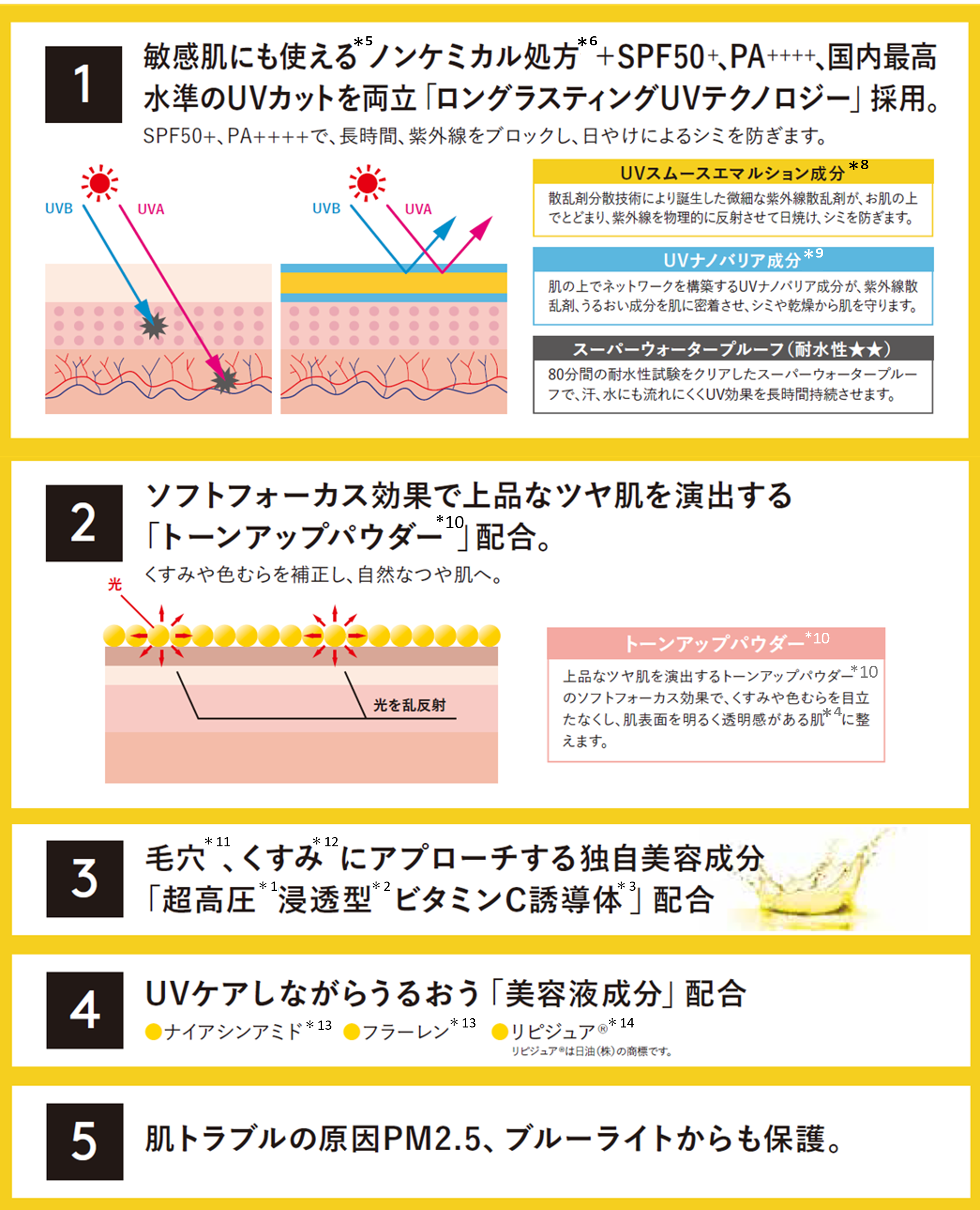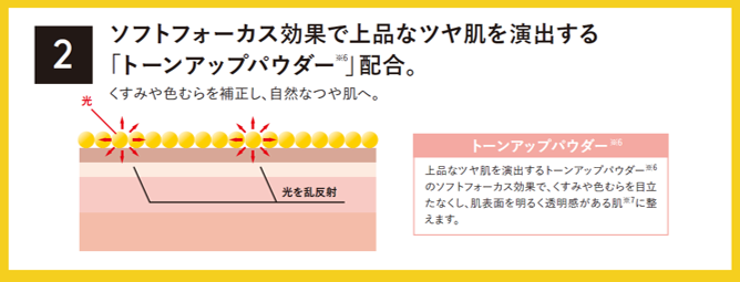 *1超高圧加工処理装置を用いた原料 *2角質層まで *3超高圧処理したテトラヘキシルデカン酸アスコルビル(保湿成分)*4メイクアップ効果による *5敏感肌の方によるパッチテスト済み(すべての方に皮膚刺激が起こらないというわけではありません) *6紫外線吸収剤無配合 *7気になる部分へ集中的に使用 *8酸化亜鉛、酸化チタン(紫外線散乱剤) *9セルロース(保湿成分) *10マイカ、酸化チタン(光沢剤) *11肌にうるおいを与え、乾燥により目立った毛穴を目立たなくすること *12乾燥してキメが乱れた肌 *13保湿成分 *14ポリクオタニウム-51(保湿成分)