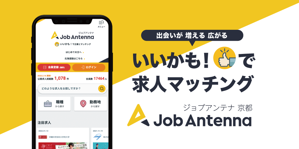 京都には、伝統産業や製造業、観光業、ハイテク産業などの重層的な産業構造があり、大企業から中小企業まで数多くの地場産業が立地するなど、求人・転職メディア市場として魅力の大きな地域です。また京都は、大学や研究機関が集積している立地を活かし長く起業支援に取り組んできた地域でもあり、バイオ、ものづくり・ロボティクス、AI/IoTなど幅広い分野で450社以上のスタートアップ企業が存在しているといわれています。このように、京都ならではの知名度の高い地場産業・企業が多く存在していること、またジョブアンテナと親和性の高いスタートアップ企業が多く集まっていること、更には京都市においては人口の10人に1人が大学生であるなど、学生を中心に20歳~25歳の若者が多い地域性を踏まえ、京都を新たな参入エリアとして決定しました。