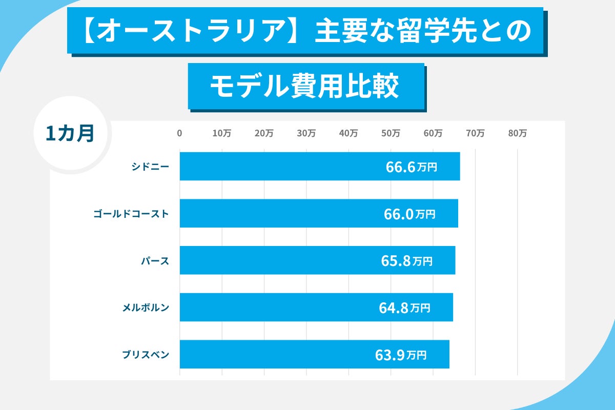 オーストラリアは授業料が比較的安く、いずれの地域においても、1か月あたりの留学費用は60万円台に抑えられています。
