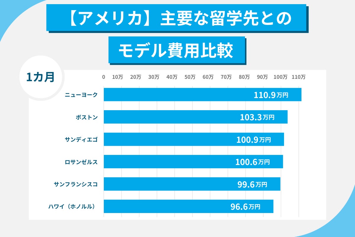 アメリカでは、ニューヨーク110.9万円、ボストン103.3万円、ロサンゼルス100.6万円など、大都市では1か月あたり100万円前後の留学費用が必要です。