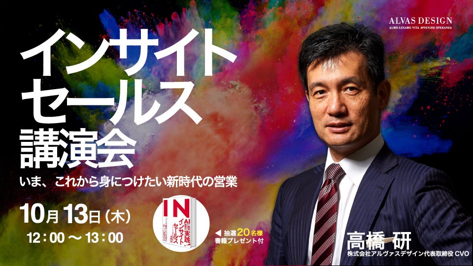 株式会社アルヴァスデザイン(東京都港区 代表取締役 CVO高橋研)は、10月13日に「インサイトセールス講演会」をウェビナ―形式で無料開催いたします。「実践!インサイトセールス」の著者:高橋研が、「いま、これから身につけたい新時代の営業とは?」をテーマにライブ講演いたします。直近の営業市場の調査データを踏まえながら、濃密な情報を1時間に詰め込んでお届します!抽選で20名様に書籍プレゼントも。
