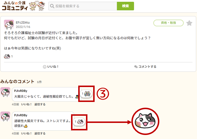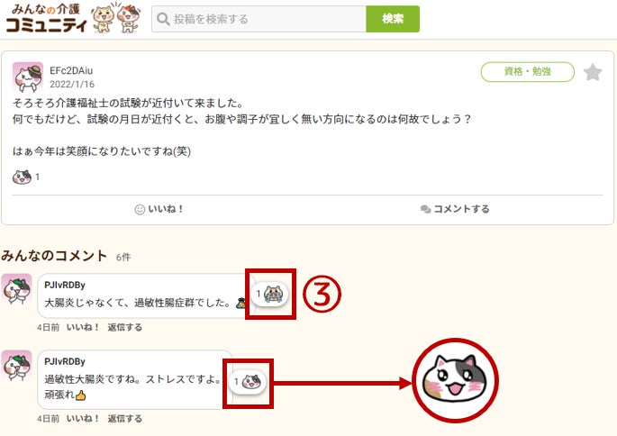 相談者のコメントやそれに対する返答に、喜怒哀楽豊かな表情で反応できるよう、スタンプの種類が増えました。「みんなの介護コミュニティ」は、介護に従事している方の仕事の息抜きとしてもご利用いただいており、毎日書き込んでくださる方もいらっしゃいます。そういったユーザーの方々が、より楽しくコミュニケーションをとって下さることができるように、スタンプの充実を図りました。(以下、スタンプを掲載)