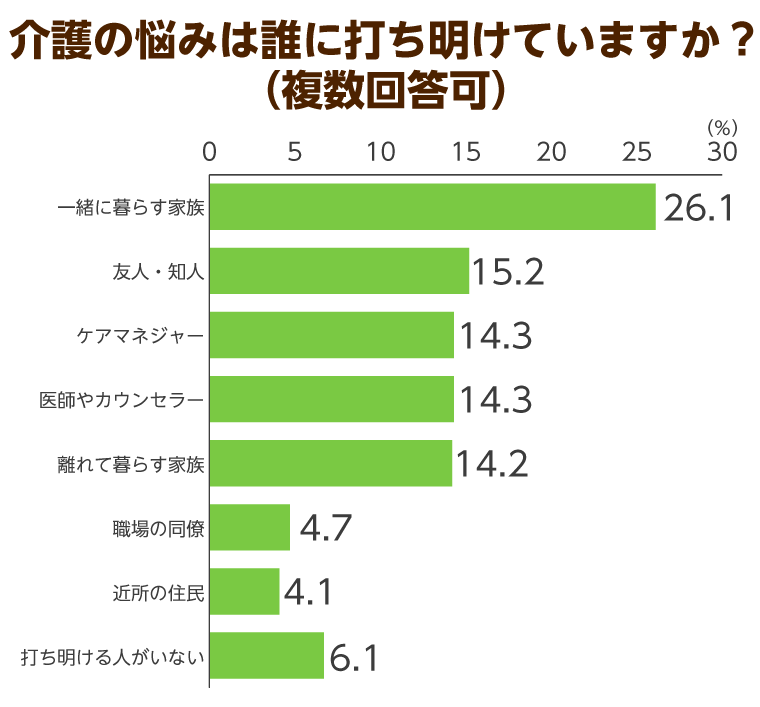 「みんなの介護」が独自に行ったアンケートによると、介護の悩みの相談相手は「一緒に暮らす家族」が第1位で、次いで第2位が「友人・知人」でした。