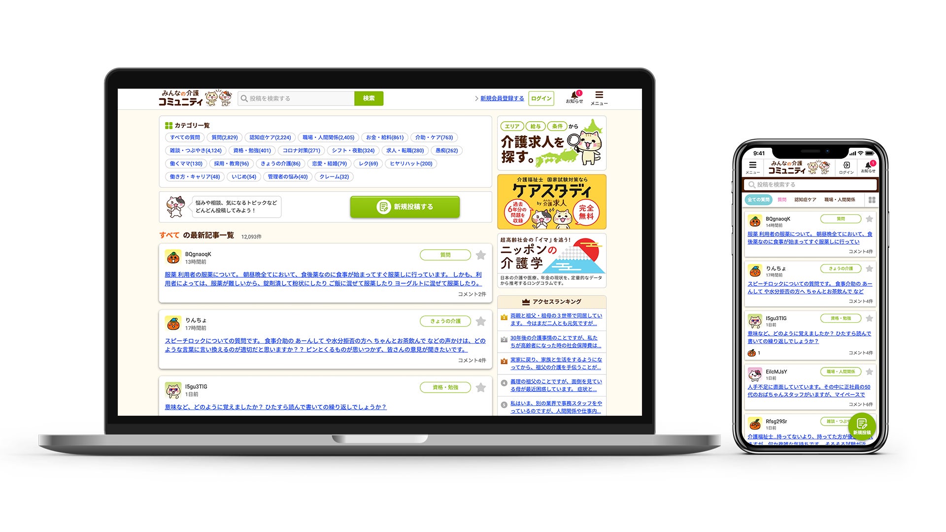 今回リニューアルした「みんなの介護コミュニティ」は、介護にまつわる悩みを、匿名で、いつでも、無料で気軽に書き込みできるサービスです。ご家族を介護されている方から、施設に勤務していらっしゃる介護職の方、これから介護福祉士などの資格取得を目指す方まで、幅広くご利用頂いております。