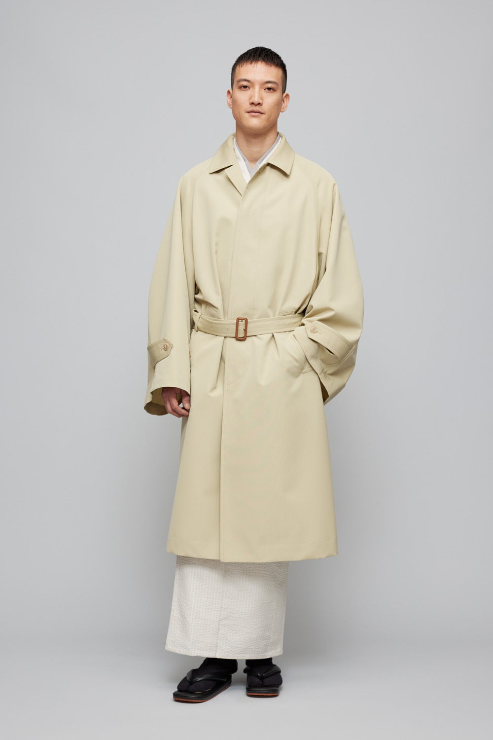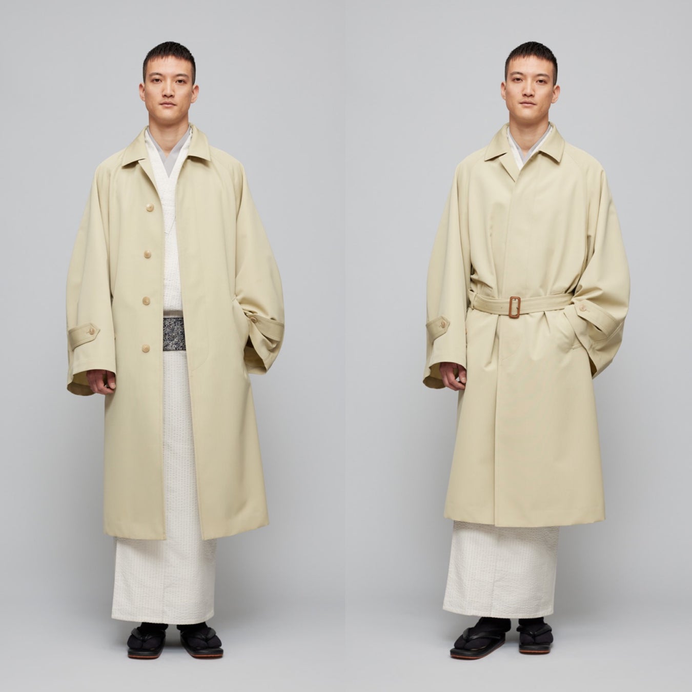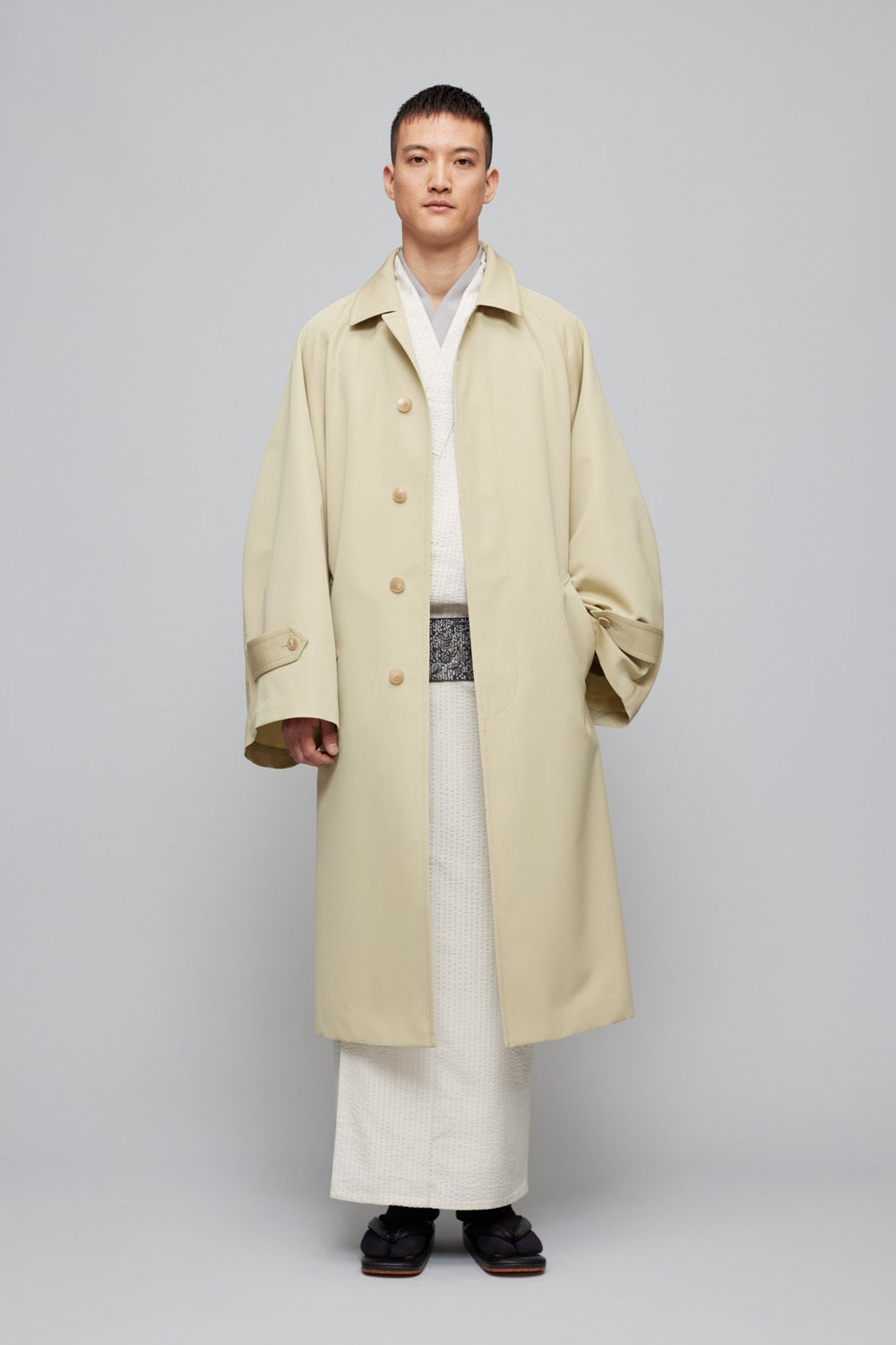着物の上にも着用できるよう袖幅や袖口を変形した上で、腕の上げ下げがしやすいように調整されたステンカラーコート。AURALEEの上質な極細繊維のスーパー120's原料のウールを使用し、限界まで打ち込み、高密度に織り上げた “ウールキャンバス” を使用しています。独特な質感とハリ感が特徴です。着物に合わせていただくのはもちろんのこと、洋服の上に羽織って普段使いいただけます。