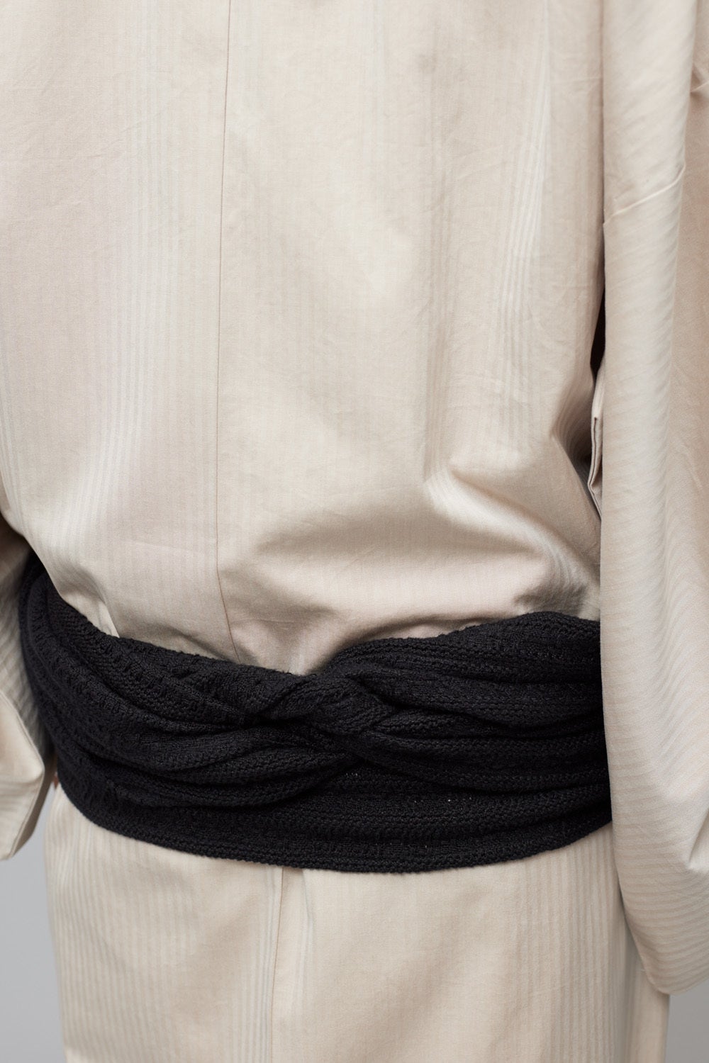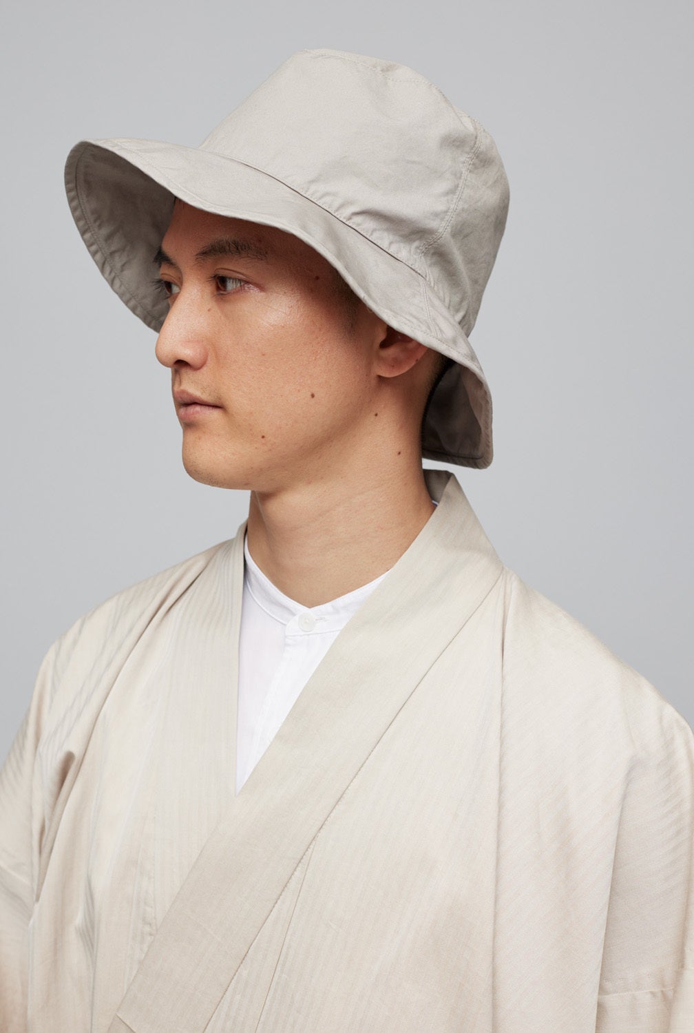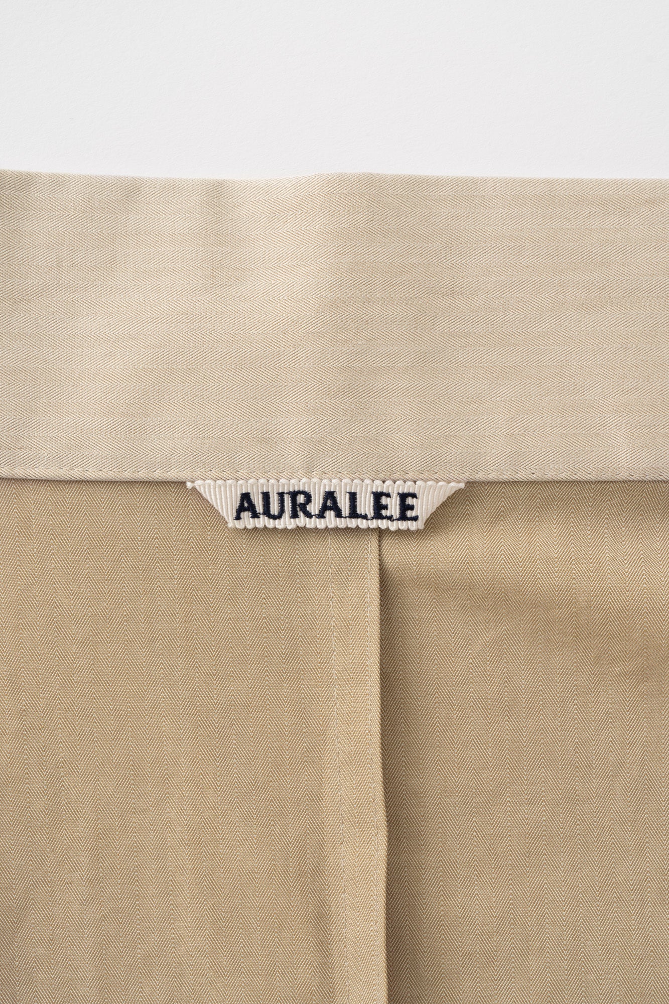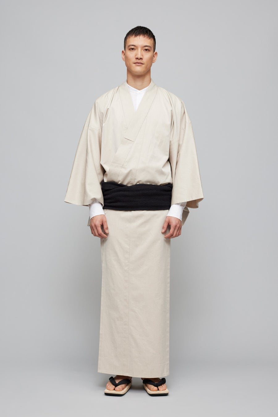 コートや羽織に加えて、AURALEE のジャケットやシャツ、パンツに使用されているオリジナル生地から着物も展開。生地は先染めした細番手のフィンクスコットンを使用し、しっかりと高密度に打ち込んだ “ヘリンボーンシャンブレー” 。柔らかい風合いにするため、何度も生地をたたいてもみ洗いする加工が施されています。上質な光沢感と滑らかな肌触りが特徴です。