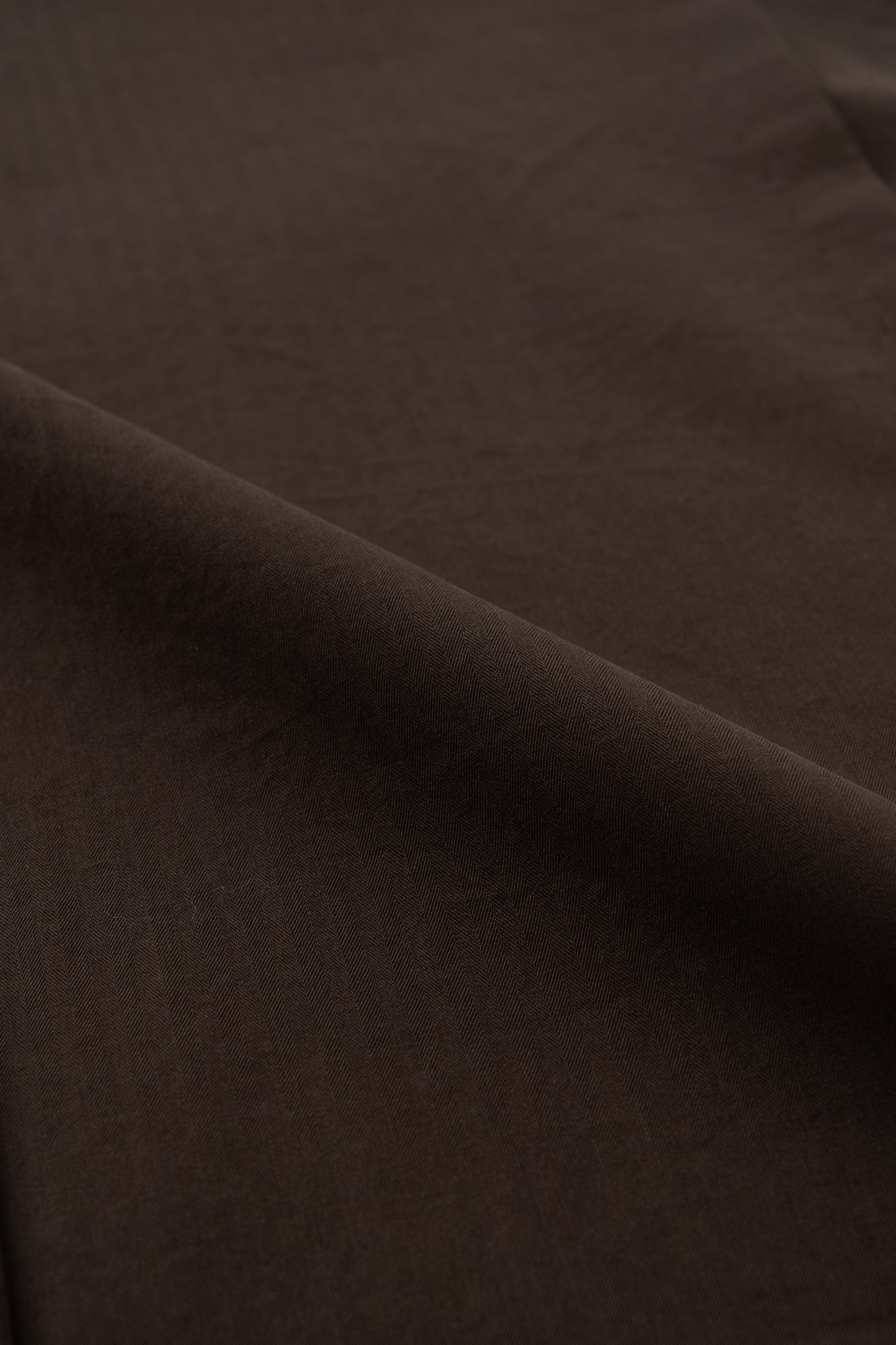 上質な極細繊維のスーパー140’sのウールを使用し、限界まで高密度に織り上げた生地。仕上げにウールの伸縮性を活かしてハリやコシを最も強く出す加工と、撥水加工を施すことによって、シワになりにくく、独特な落ち感と程よい光沢感があります。