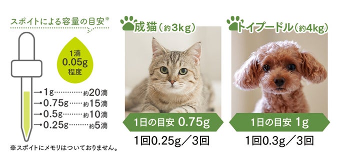 ペットの体重に応じて1kgあたり0.25gから摂取し始め、1日2~3回に分けてください。