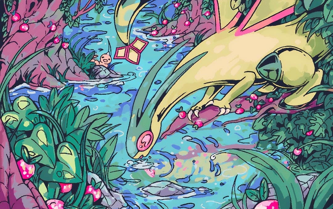 この作品のシンプルでユニークなテキスチャが目に止まりました。オーダイルが泳いでいる姿をユニークな線で表現していて、水中のリラックスした雰囲気とともにこのポケモンの魅力を際立たせていると思います。