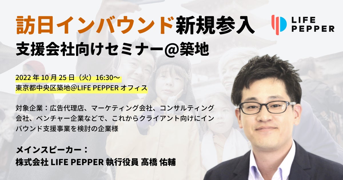 株式会社LIFE PEPPER (本社:東京都中央区築地、代表取締役社長:冨永 重人、吉田 行弘、斉藤 諒、以下「LIFE PEPPER」)は、これから訪日インバウンド支援事業部を立ち上げる広告代理店、マーケティング会社、コンサルティング会社、ベンチャー企業 など全ての事業者様に向け、翌日から訪日インバウンド市場に関する提案が可能になる、実践的なセミナーの開催を行います。