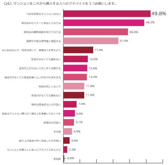 一番多かったアドバイスは「100%完璧なマンションはない」。だからこそセミナーへの参加や専門家への個別相談で疑問や不安をしっかりと解決することを勧める声も目立つ結果に。その他にも「頭金が少なくても資金計画にムリがなければ大丈夫」や「貯金や年収が少なくても諦めない」といった資金にまつわるアドバイスも上がった。