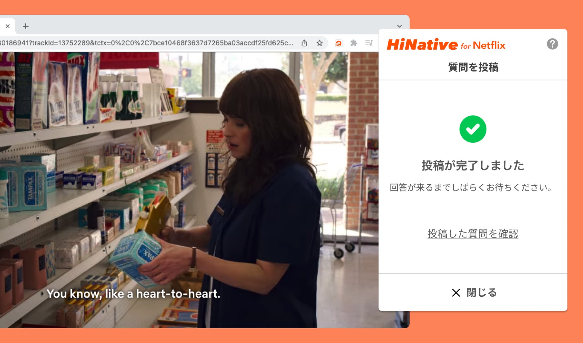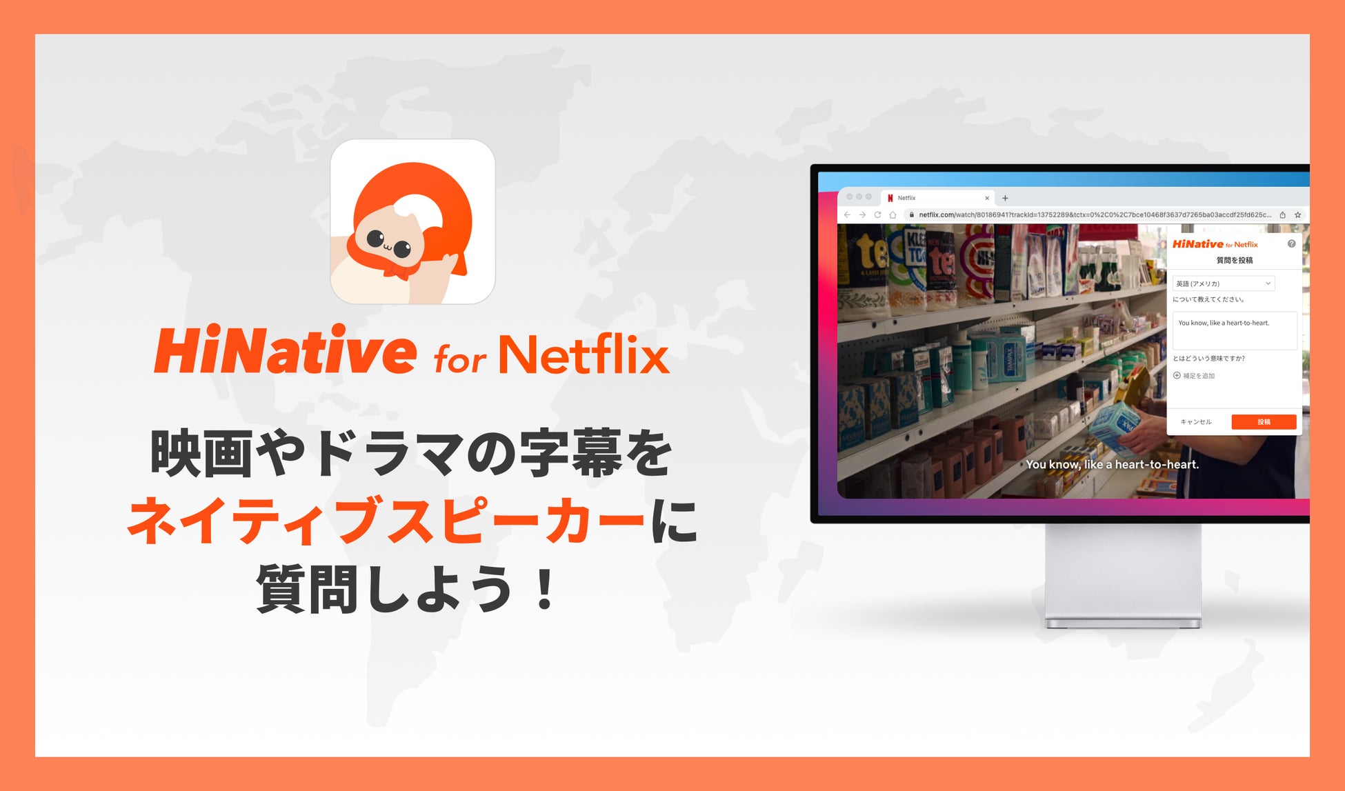 今回リリースしたGoogle Chromeの「Hinative for Netflix:https://chrome.google.com/webstore/detail/hinative-for-netflix/nlfckkicjjjkhmfjofoglcffaenpiojl?hl=ja 」は、映画やドラマの中に出てくる単語の使い方や表現などを、ボタン1つでHiNativeのネイティブスピーカーに質問できるサービスです。