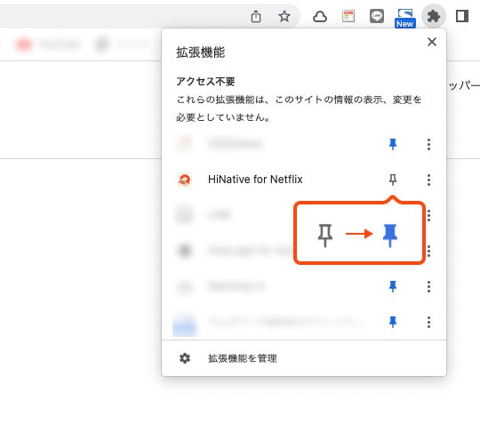 - 追加後、画面右上の拡張機能ボタンをクリックし、ピンをクリックするとツールバーに拡張機能が表示されるようになります。