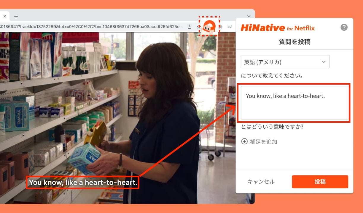 Netflixで好きな動画を再生し字幕モードで再生します。分からない表現があったら、HiNativeの拡張アイコンを押すだけで、再生されている部分の字幕がそのままHiNativeサービスの質問投稿欄にコピーされます。
