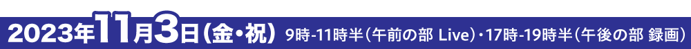 セミナー日時 | 11月3日(金・祝) ➀午前の部 9時~11時半(LIVE) ➁午後の部 17時~19時半(録画) |