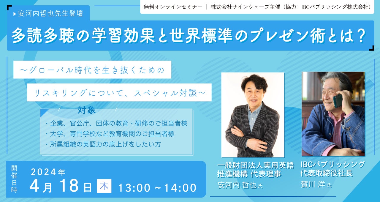 株式会社サインウェーブ(所在地:東京都千代田区、代表取締役:赤池雅光、以下サインウェーブ )は、人事・研修・教育関係者を対象とした無料オンラインセミナーを、4月18日(木)13:00〜14:00に開催します。プログラムは安河内哲也先生の基調講演に加え、安河内先生と賀川洋氏(IBCパブリッシング株式会社代表取締役社長)のスペシャル対談、ラダーシリーズを活用した英語学習、社会人・大学生向け英語学習アプリ「ELST(R)Biz」を使った学習法など盛沢山。これからの英語教育について「多読多聴」をテーマにお届けします。