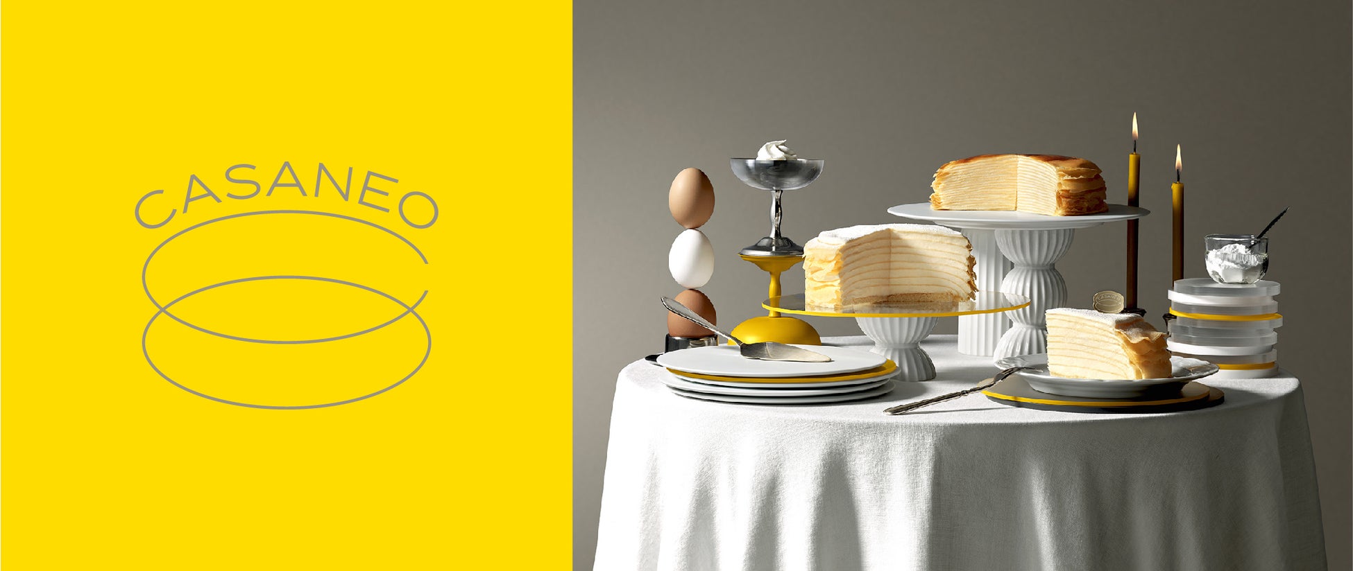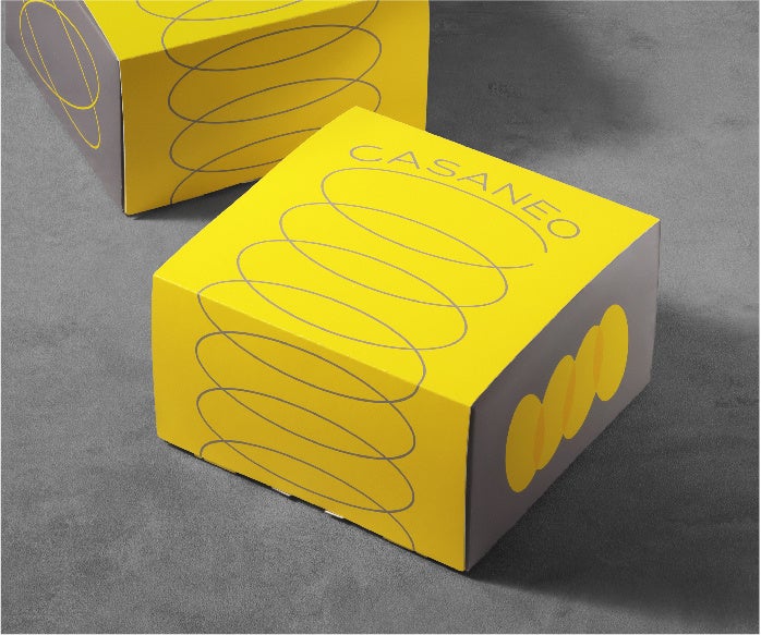 ロゴデザインは、CASANEOの最初と最後の文字「CとO」を用いてロゴマークを構成。円のような2つの文字を重ねることで、ミルクレープの特徴である「重なるクレープ」を表現しています。このグラフィックパターンをケーキ箱や店頭のサインなどにも展開しています。ブランドカラーは、新しさやクレープ生地を連想させる鮮やかなイエローに、伝統や職人の洗練された技を感じさせる落ち着いたグレーを組み合わせることで、「ミルクレープ専門店の伝統と革新」を表現しています。