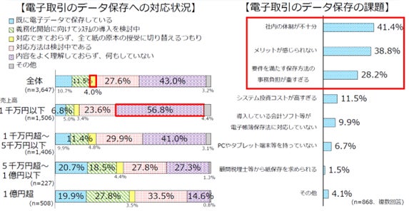 一方、我が国の中小企業には請求書を含む帳簿書類を紙で保存する文化が色濃く残っています。特に売上高1千万円以下の小規模事業者においては、約6割の事業者が電子帳簿保存法改正について内容をよく理解しておらず、何もしていないという調査結果も出ています(2022年9月度調査結果)。