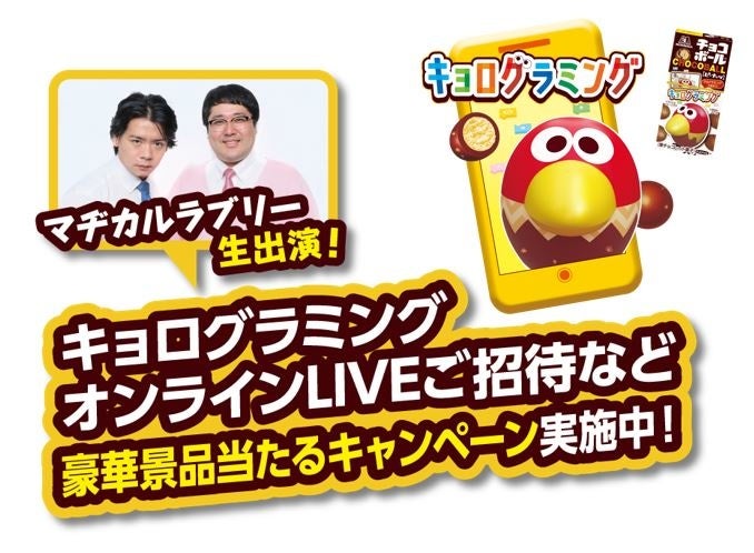 「キョログラミング」とは、小学校で必修化されたプログラミング学習をキョロちゃんと一緒に楽しく学べるアプリです。専用のアプリで読み取ることにより「チョコボール」の粒や箱を使って親子とも関心の高いプログラミングが学べます。オンラインLIVEでは「キョログラミング」を「マヂカルラブリー」といっしょに体験します。
